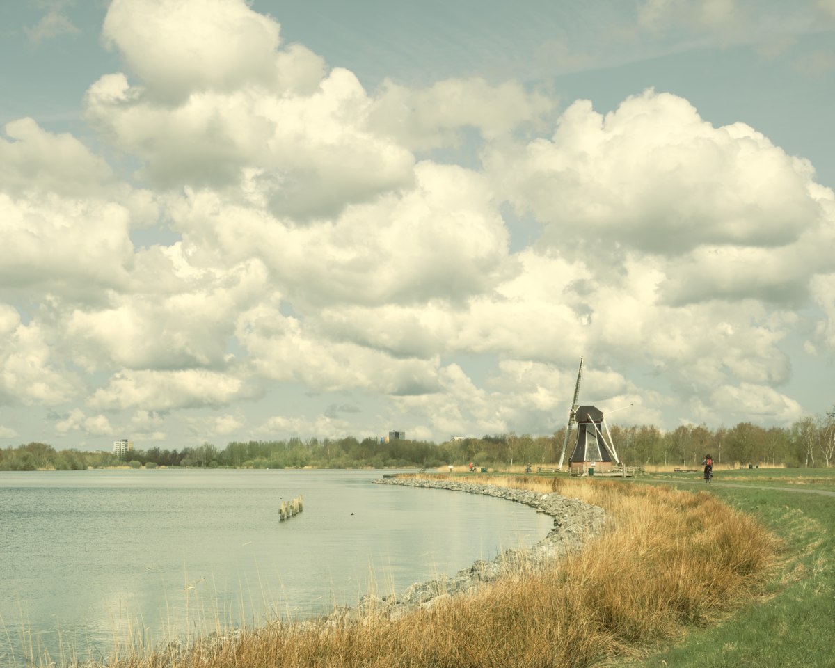 Hollandser wordt het bijna niet. Wolken luchten, weids uitzicht een molen in de verte en een eenzame fietser. Voorjaar in Groningen rondom het Paterswolder meer.